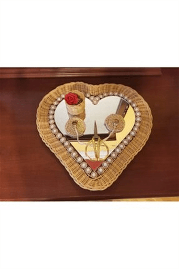 Bambudan örülmüş özel tasarım olan bu servis tepsisi, Söz, Nişan gibi özel günlerde kullanabileceğiniz, ortası aynalı ve cevresi taşlarla süslenmiş çok amaçlı bir üründür.