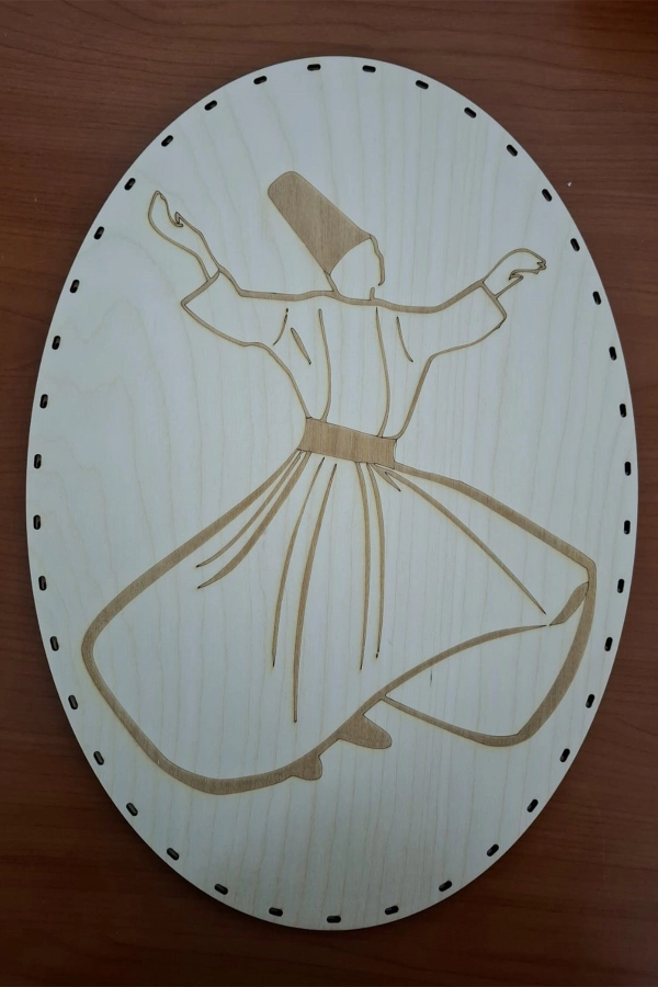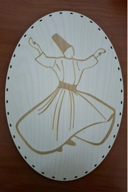 Sonay'ın Atölyesi'nde tasarlanan tepsi alt tabanları plywood 3mm lik ahşaptan yapılmaktadır. Yanlarının bambu ile örülmesi için bambu çaplarına uygun olarak delinmektedir. Oval tepsi tabanı yada bambu kullanarak saç örgüsü modeliyle yapılacak bir çerçeve ile DUVAR PANOSU olarak kullanabililisiniz. Ahşap tabana, dönen semazen işlenmiştir. Ölçüleri boyu 38 cm, eni 28 cm dir. Delik çapı 2-2,5 mm lik bambular için uygun olum 6,2 mm uzunlugundadır ve 3 bambu çubuğu girebilir. Resimler lazer makinasında yakma ile yapılmaktadır.