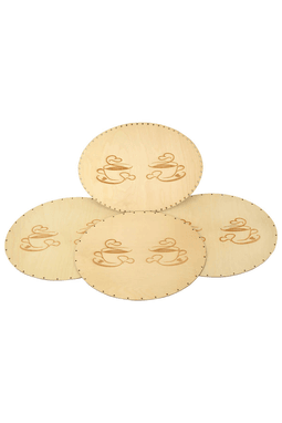 Sonay'ın Atölyesi'nde tasarlanan tepsi alt tabanları plywood 3mm lik ahşaptan yapılmaktadır. Yanlarının bambu ile örülmesi için bambu çaplarına uygun olarak delinmektedir. Oval tepsi tabanına kahve fincan resimleri işlenmiştir. Ölçüleri boyu 38 cm, eni 28 cm dir. Delik çapı bambu çaplarına göre 3 mm lik (5adet) ve 4 mm lik (3adet) olarak delinmiştir.