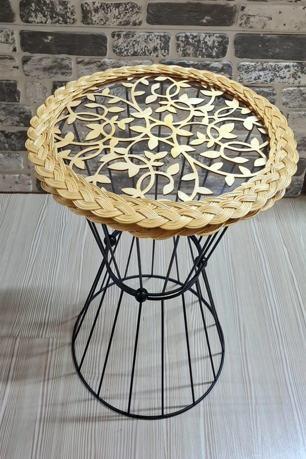 Sonayın Atölyesinde elle yapılan retro sehpanın ÖZGÜN tasarımı Sonay hanıma ait olup sizler için çok şık bir sehpa üretmiştir. Elle yapıldığı için fazla stok bulundurulamamaktadır, fakat siparişe görede üretim yapılmaktadır. Elle yapıldığı için el farkı olarak birebir aynı olamamakla birlikte, renk tonunda yada motiflerde çok ufak farklılıklar olabilmektedir. Fakat bu farklarda anlaşılmamaktadır. Bambu Rattanla örülen sehpa 38 cm capındadır ve sehpanın alt ve üst tarafı pleksi camdan yapılmıştır. Sehpanın yanları saç örgü motifi ile 6 kat olarak örülmüştür ve pleksi camlar arasındaki motifler Huş ağacı üzerine işlenerek lazerle kesilmiştir. Evinizde yada iş yerinizde kullanacağınız sehpalar hemen dikkatleri cekecektir. Sehpa ayakları siyah perforje metaldir. Sehpanın yüksekliği 57 cm ve sehpa üst çapı 38 cm dir. Montaja gerek yoktur, kurulu gönderilmektedir.
