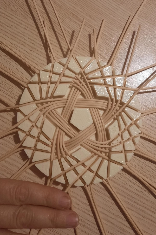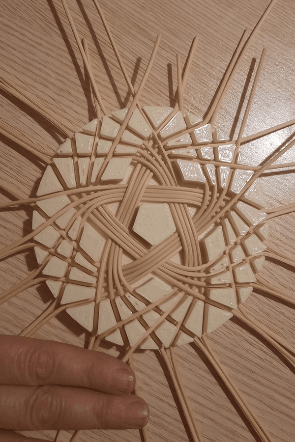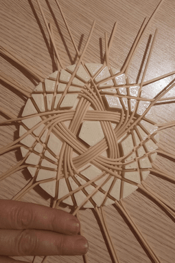 Kalıp çapı 12,5 cm dir. Kalıp göbeği yani tam ortası 5 köşelidir ve her köşeye 4 er adet 2 mm yada 2,5 mm lik bambu yerleştirilerek çalışılmalıdır ve bambular, resimdeki gibi 5 köşeli ortadaki şekle bitişik olmalıdır. Bu şekildi düzgün cıkmaktadır.
