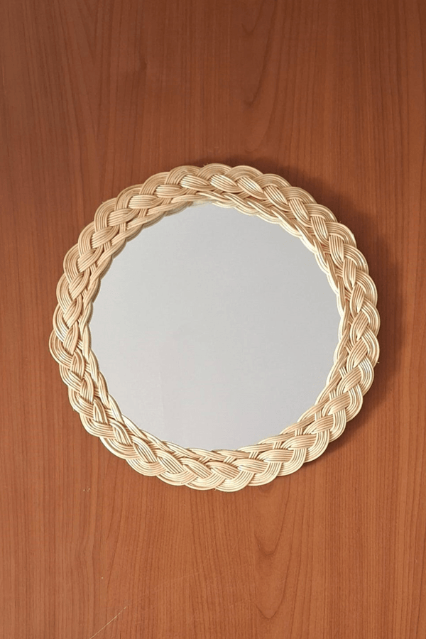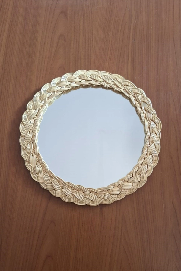 Sonay'ın Atölyesi'nde doğal bambudan elle yapılmıştır. Şık ve çok çekiçi zarif tasarımı Sonay hanıma ait olup iç mekanınıza belli bir tarz katmak için tasarlanmıştır. Her oda için mükemmel bir dokunuşla evinizi daha güzel ve elit hale getirecek dekoratif bir üründür. Şişe camın flotal 4 mm lik en kaliteli ayna camı kullanılmıştır. Ayna arka tabanı için ithal huş ağacı kullanılmıştır ve asma aparatı çelik tel ile yapılmıştır. Cerçevesi bambu ile saç örgü modeliyle örülmüştür ve şeffaf olarak verniklenmiştir. Bu dekoratif ayna; EV HEDİYESİ ya da ÖZEL GÜNLER için arkdaşlarınıza ve dostlarınıza harika bir hediye olacaktır. Yuvarlak tasarımlı ayna dış çapı 30 cm dir.