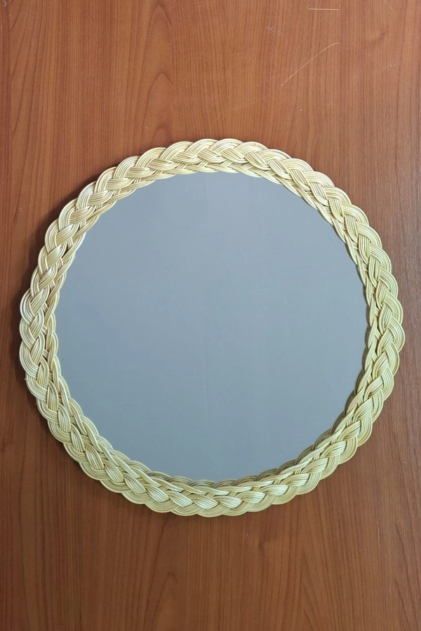 Sonay'ın Atölyesi'nde doğal bambudan elle yapılmıştır. Şık ve çok çekiçi zarif tasarımı Sonay hanıma ait olup iç mekanınıza belli bir tarz katmak için tasarlanmıştır. Her oda için mükemmel bir dokunuşla evinizi daha güzel ve elit hale getirecek dekoratif bir üründür. Şişe camın flotal 4 mm lik en kaliteli ayna camı kullanılmıştır. Ayna arka tabanı için ithal huş ağacı kullanılmıştır ve asma aparatı çelik tel ile yapılmıştır. Cerçevesi bambu ile saç örgü modeliyle örülmüştür ve şeffaf olarak verniklenmiştir. Bu dekoratif ayna; EV HEDİYESİ ya da ÖZEL GÜNLER için arkdaşlarınıza ve dostlarınıza harika bir hediye olacaktır. Yuvarlak tasarımlı ayna dış çapı 41 cm dir.